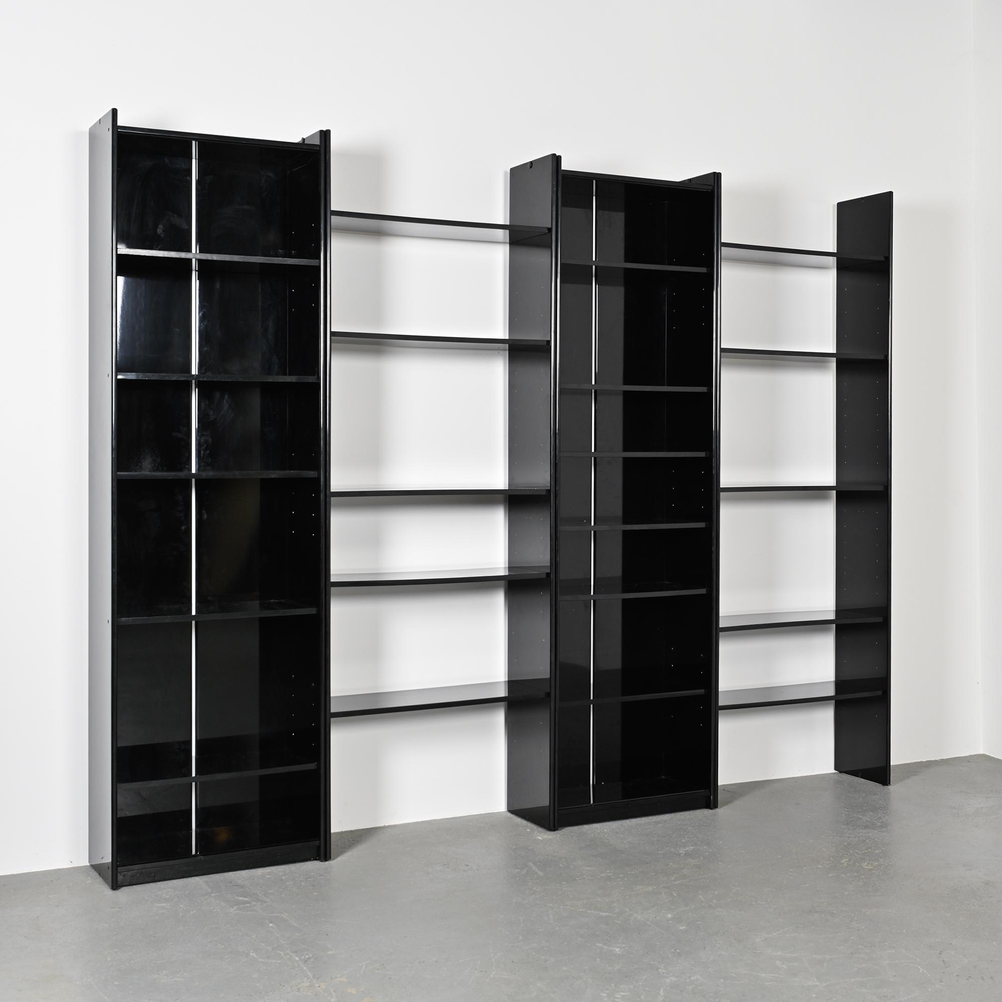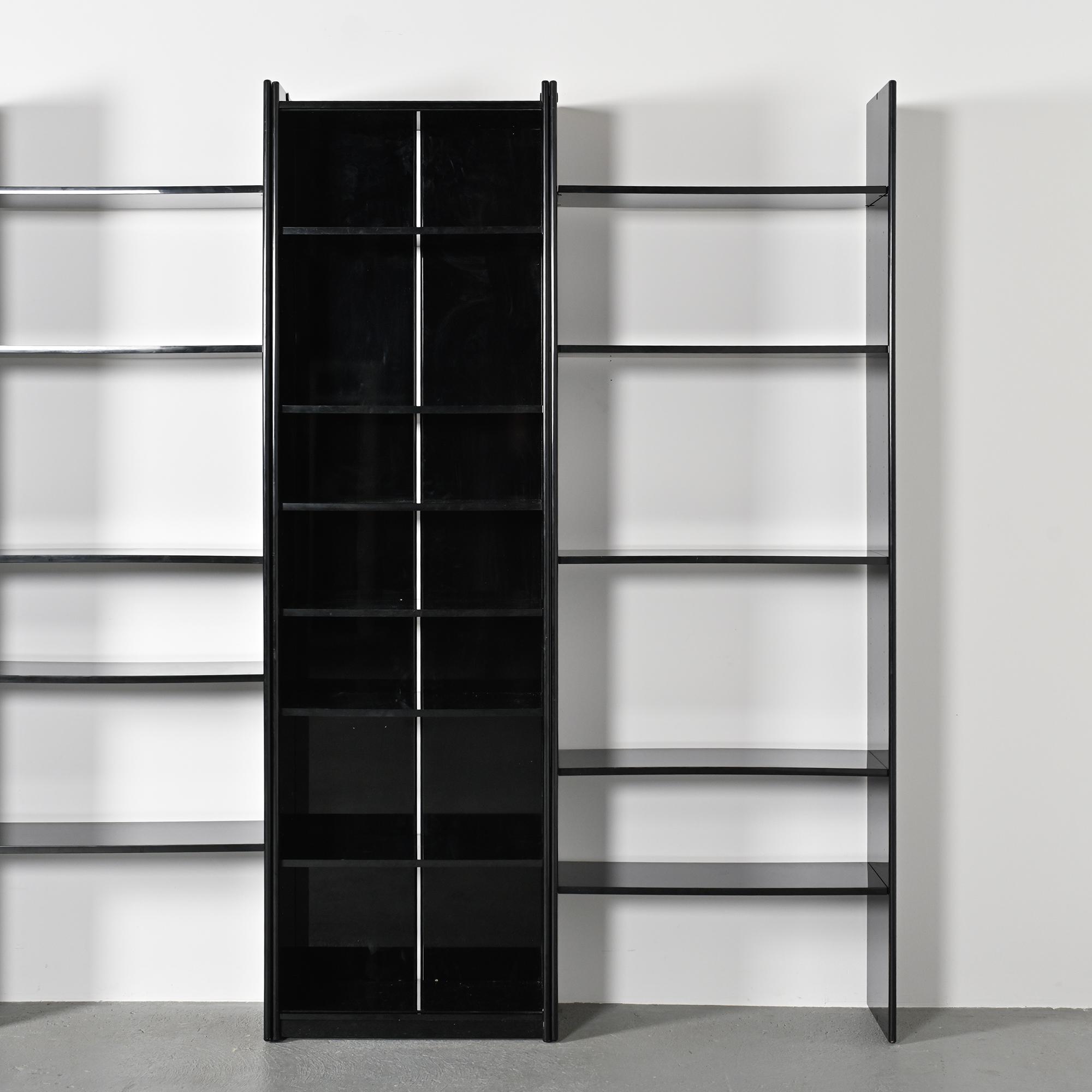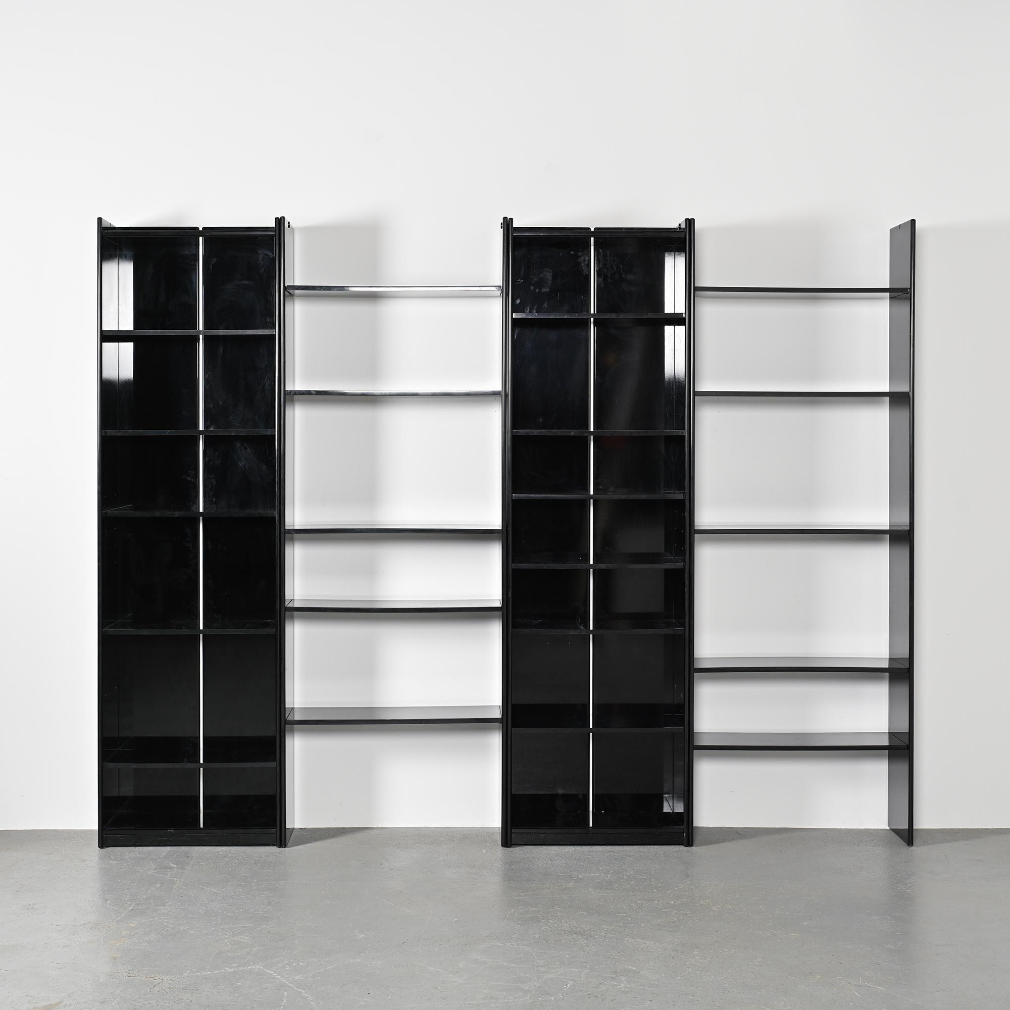 Le système se compose de modules verticaux fermés par des panneaux laqués noirs, associés à des étagères ouvertes reliant les éléments entre eux. L'ensemble repose sur une structure rigoureuse et répétitive, pensée comme une véritable architecture intérieure. Le contraste entre les volumes pleins et les parties ouvertes renforce la lecture graphique du meuble, tandis que la finition noire accentue son caractère radical et minimal. Le dessin privilégie la modularité, la flexibilité d'agencement et la clarté structurelle, principes centraux du travail de Takahama.