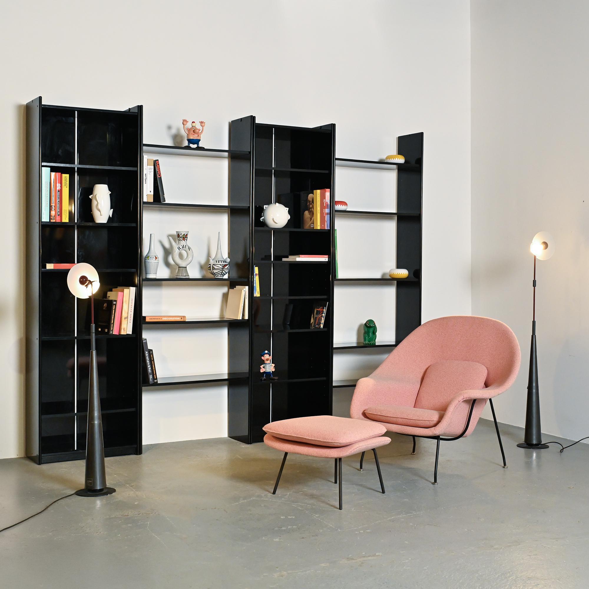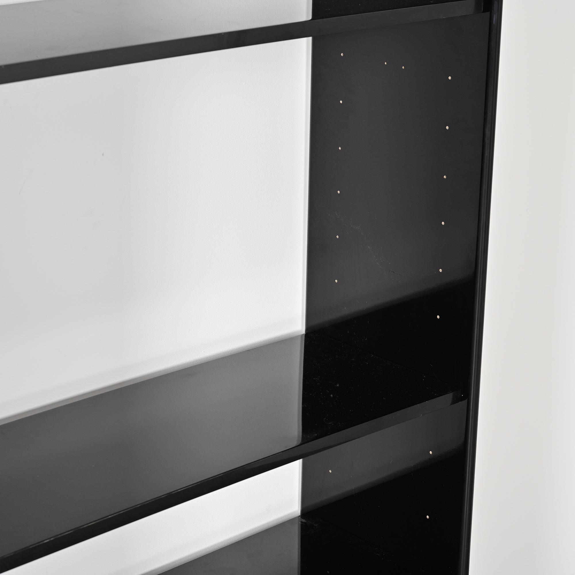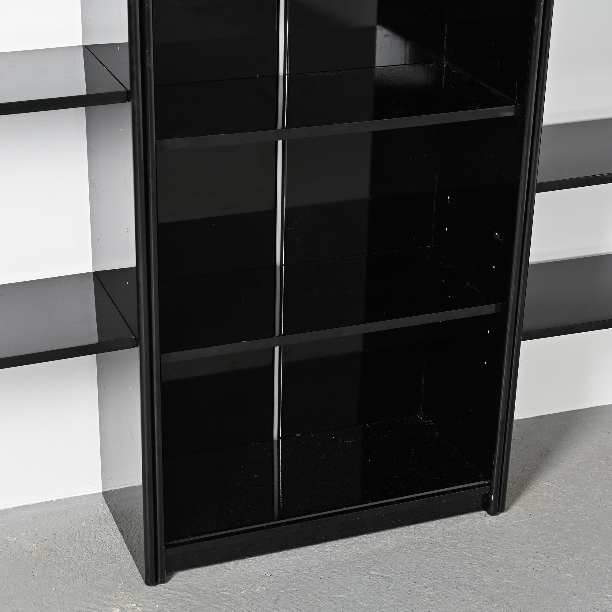 Le système se compose de modules verticaux fermés par des panneaux laqués noirs, associés à des étagères ouvertes reliant les éléments entre eux. L'ensemble repose sur une structure rigoureuse et répétitive, pensée comme une véritable architecture intérieure. Le contraste entre les volumes pleins et les parties ouvertes renforce la lecture graphique du meuble, tandis que la finition noire accentue son caractère radical et minimal. Le dessin privilégie la modularité, la flexibilité d'agencement et la clarté structurelle, principes centraux du travail de Takahama.