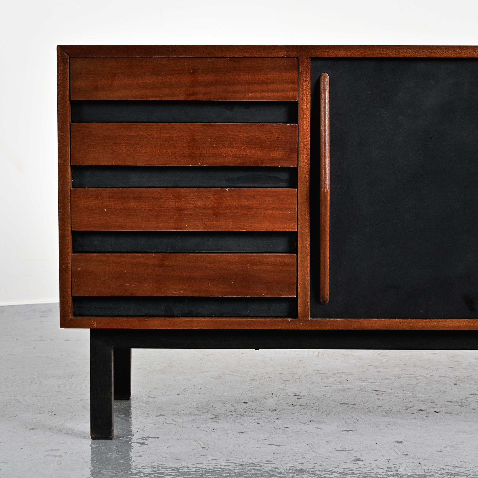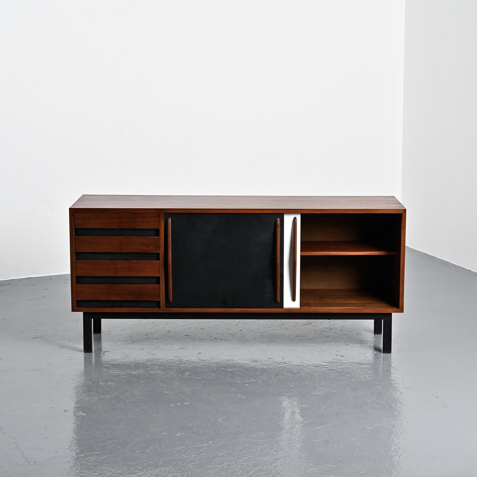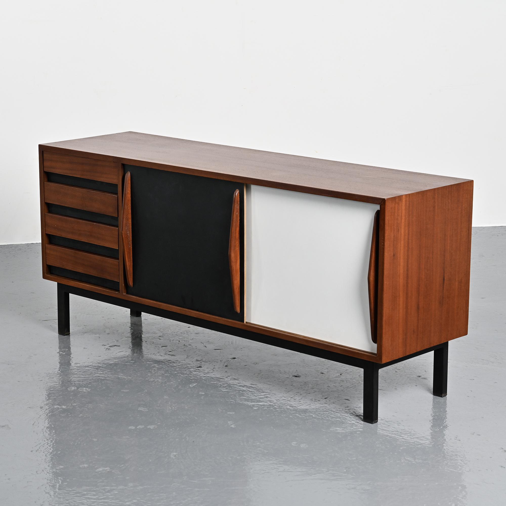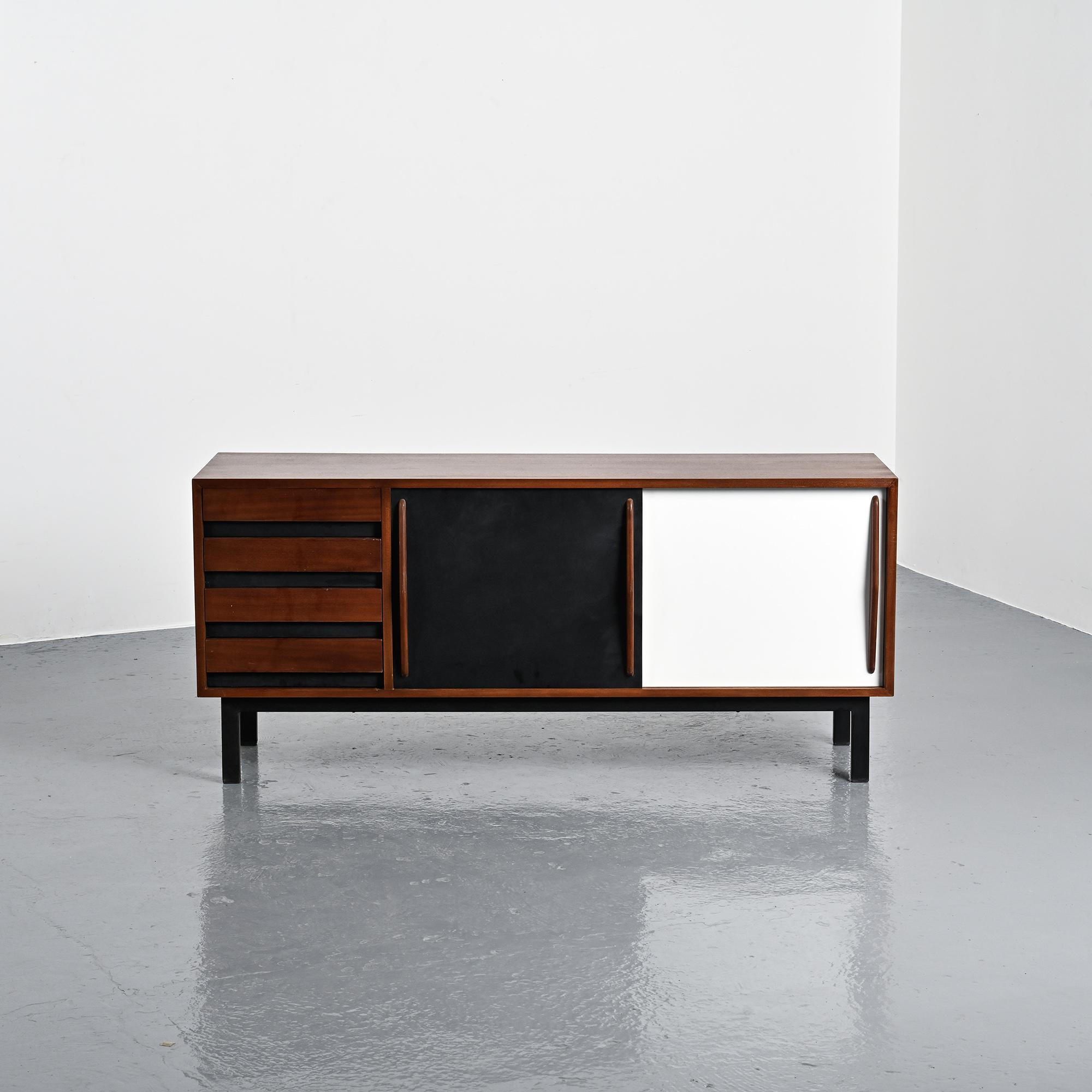 Imaginée pour la ville minière de Cansado en Mauritanie, cette enfilade incarne la rigueur fonctionnelle et l'élégance épurée propres à Charlotte Perriand. Sa structure en placage d'acajou accueille deux portes coulissantes contrastées, l'une blanche, l'autre noire, accompagnées de quatre tiroirs latéraux. L'ensemble repose sur un piétement métallique laqué noir, conférant légèreté et modernité à la pièce.