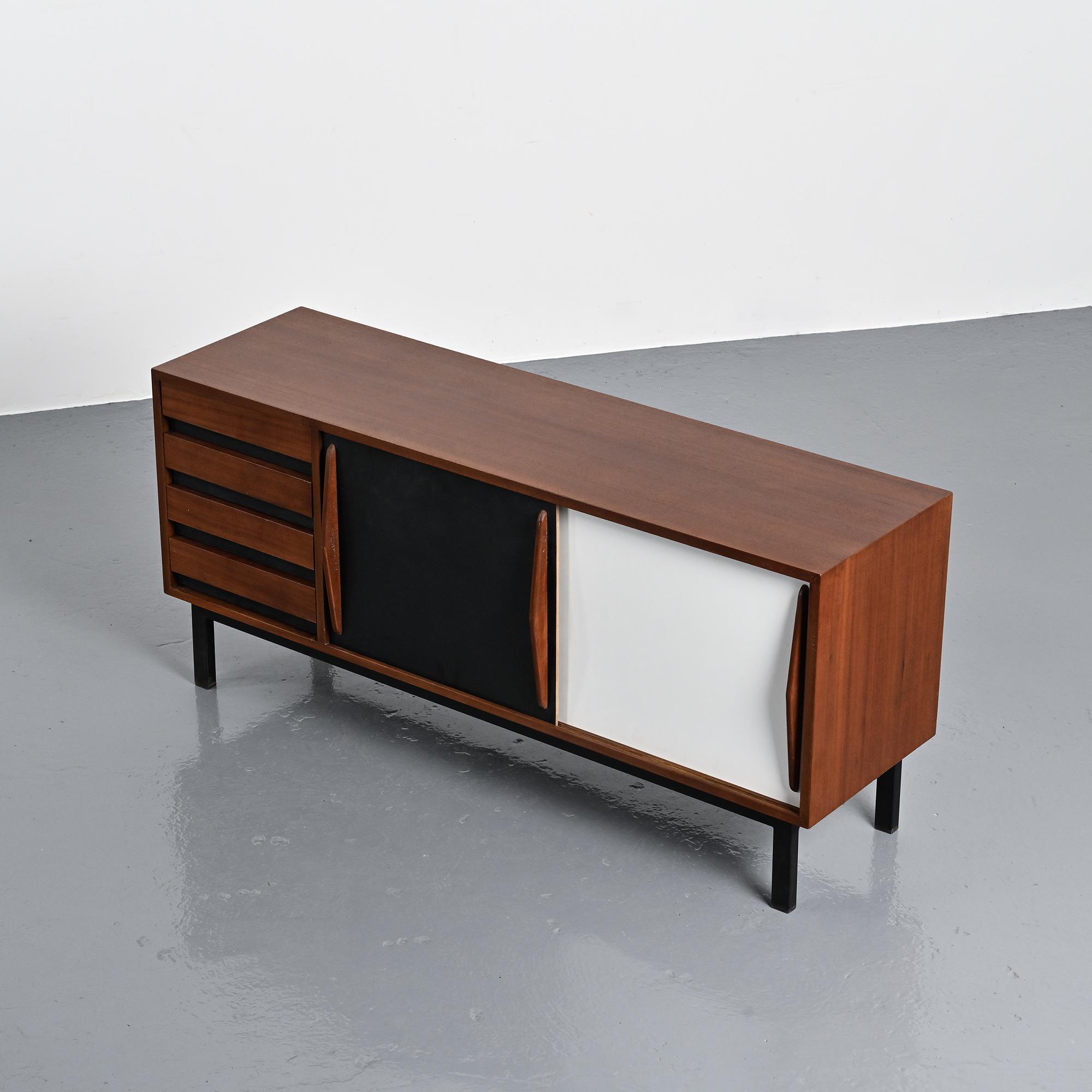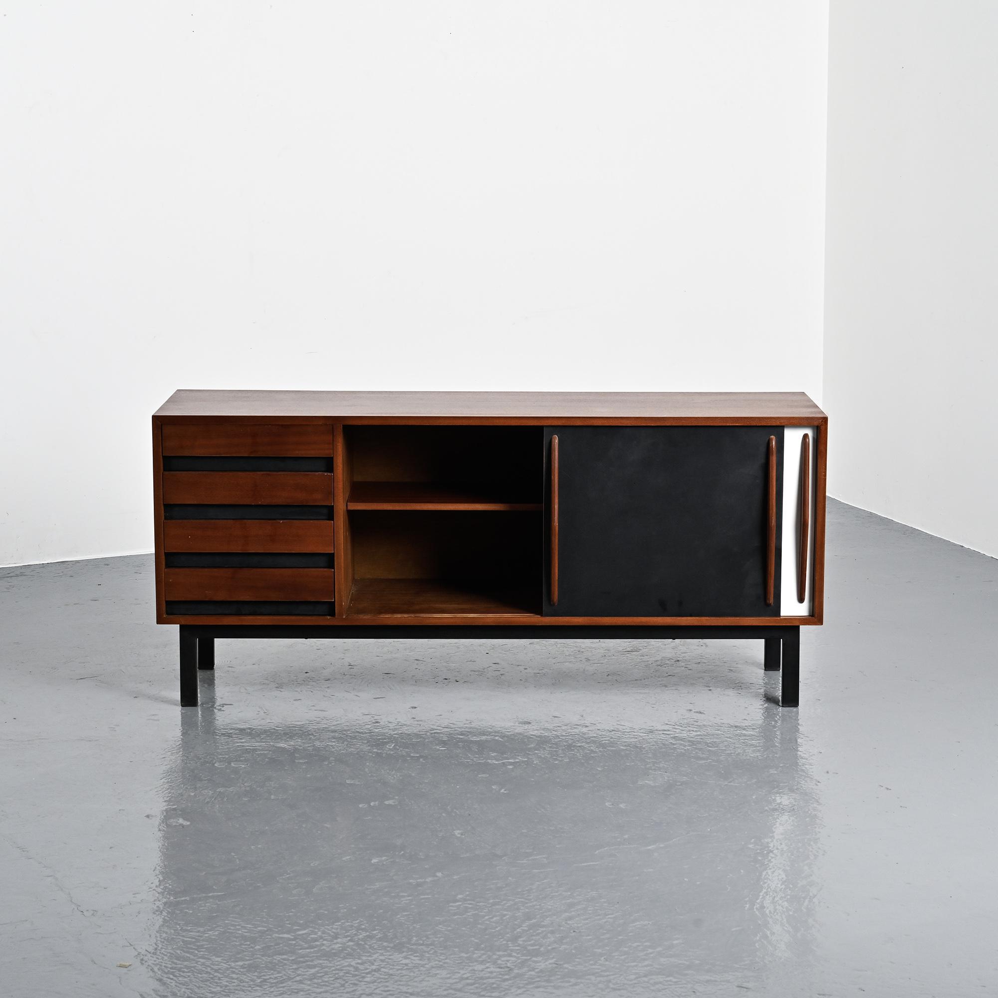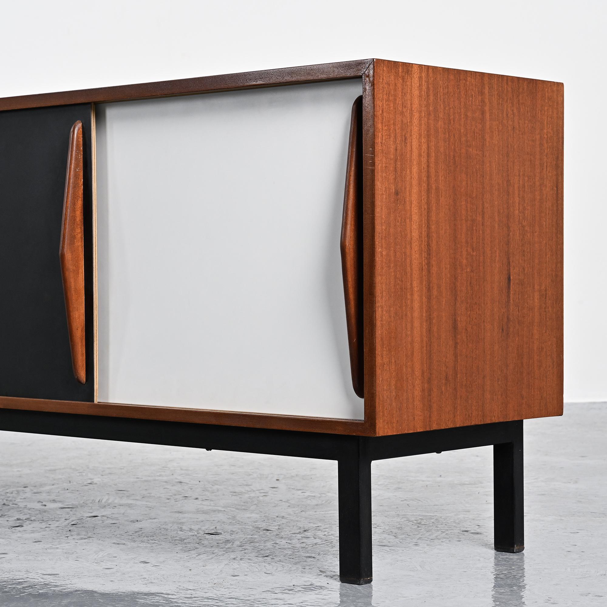 Imaginée pour la ville minière de Cansado en Mauritanie, cette enfilade incarne la rigueur fonctionnelle et l'élégance épurée propres à Charlotte Perriand. Sa structure en placage d'acajou accueille deux portes coulissantes contrastées, l'une blanche, l'autre noire, accompagnées de quatre tiroirs latéraux. L'ensemble repose sur un piétement métallique laqué noir, conférant légèreté et modernité à la pièce.
