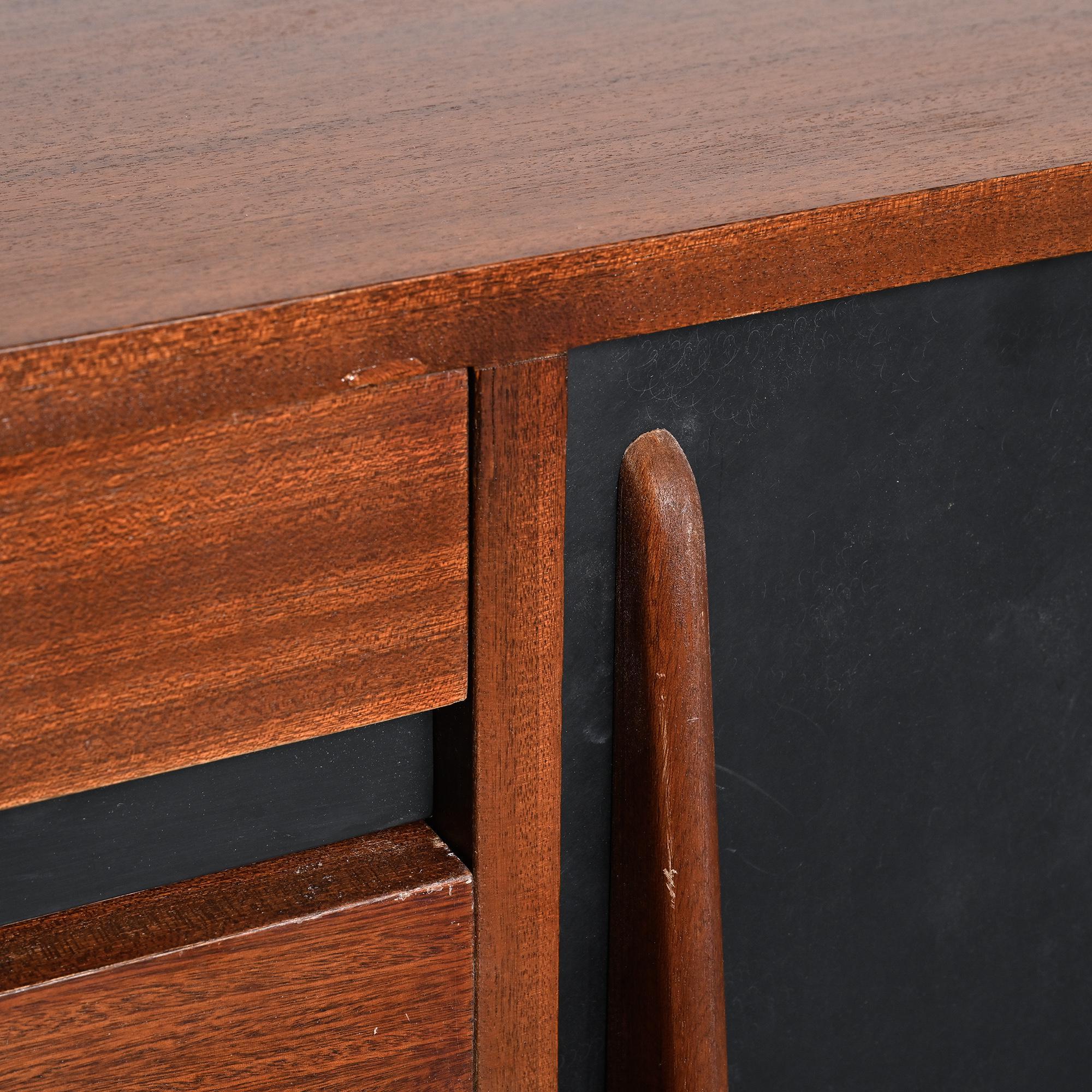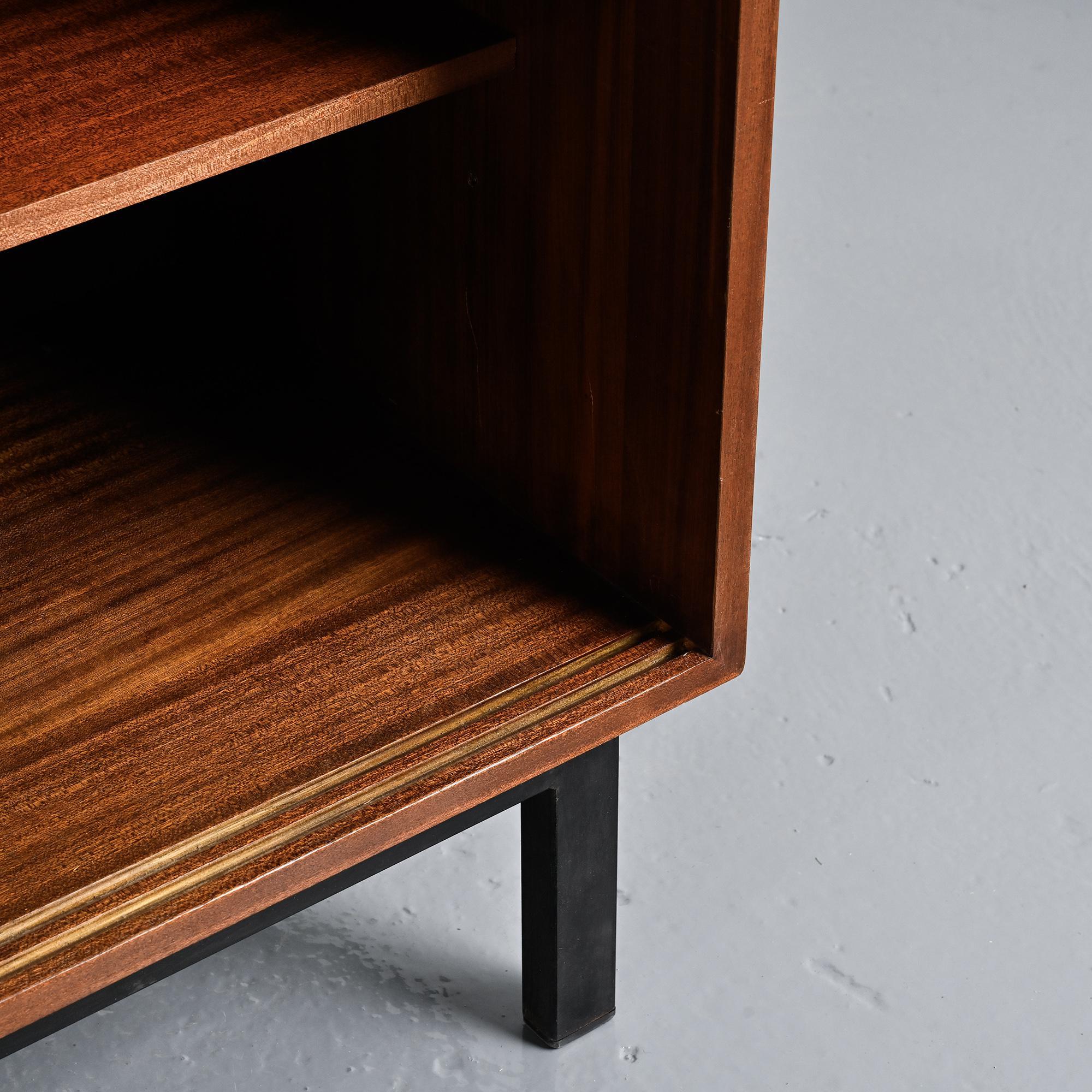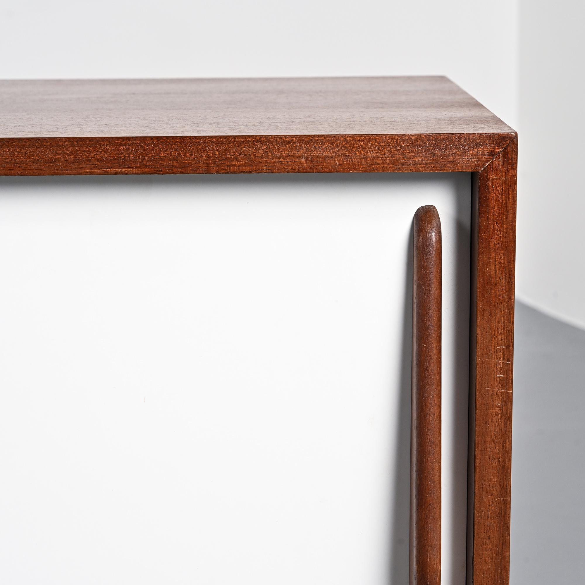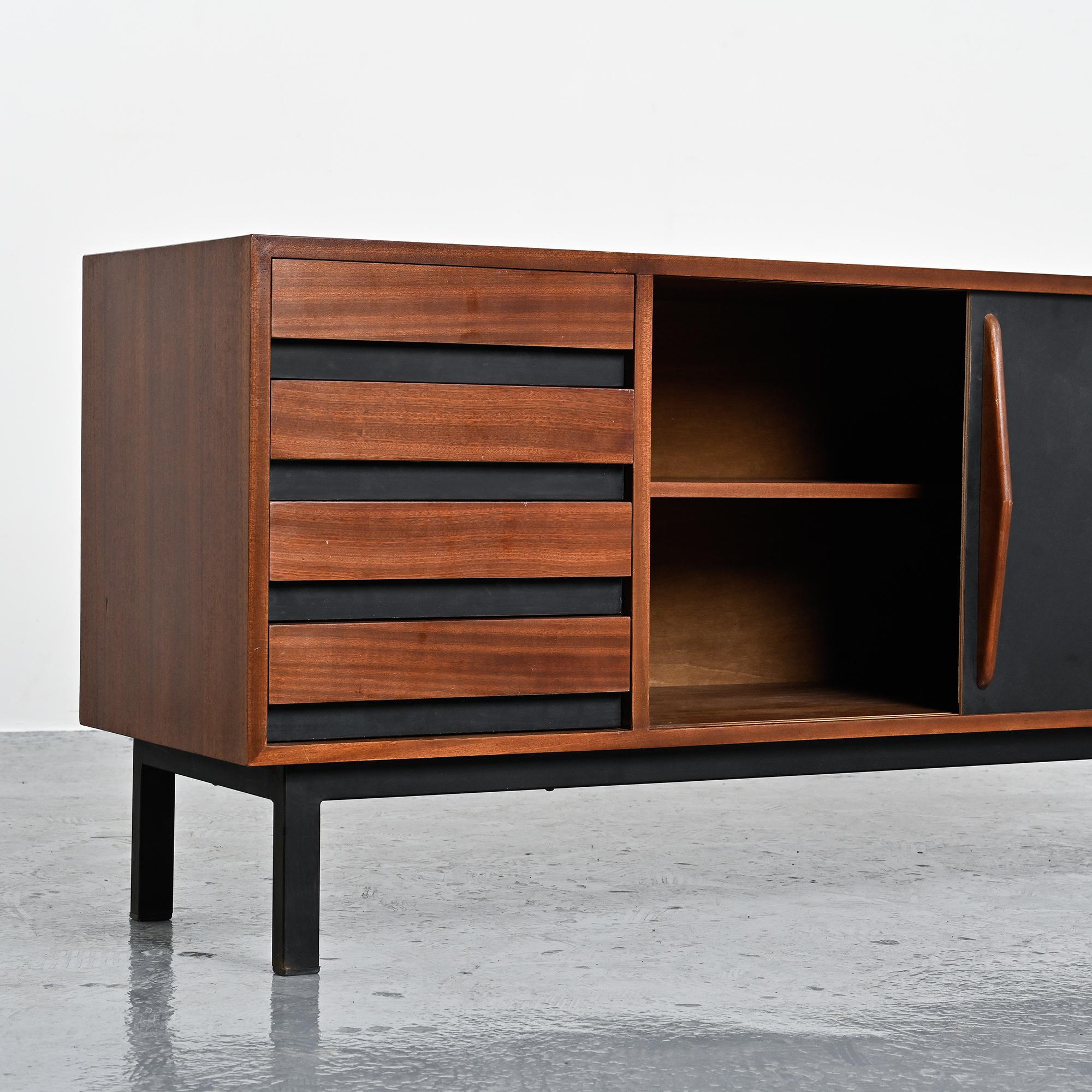 Imaginée pour la ville minière de Cansado en Mauritanie, cette enfilade incarne la rigueur fonctionnelle et l'élégance épurée propres à Charlotte Perriand. Sa structure en placage d'acajou accueille deux portes coulissantes contrastées, l'une blanche, l'autre noire, accompagnées de quatre tiroirs latéraux. L'ensemble repose sur un piétement métallique laqué noir, conférant légèreté et modernité à la pièce.