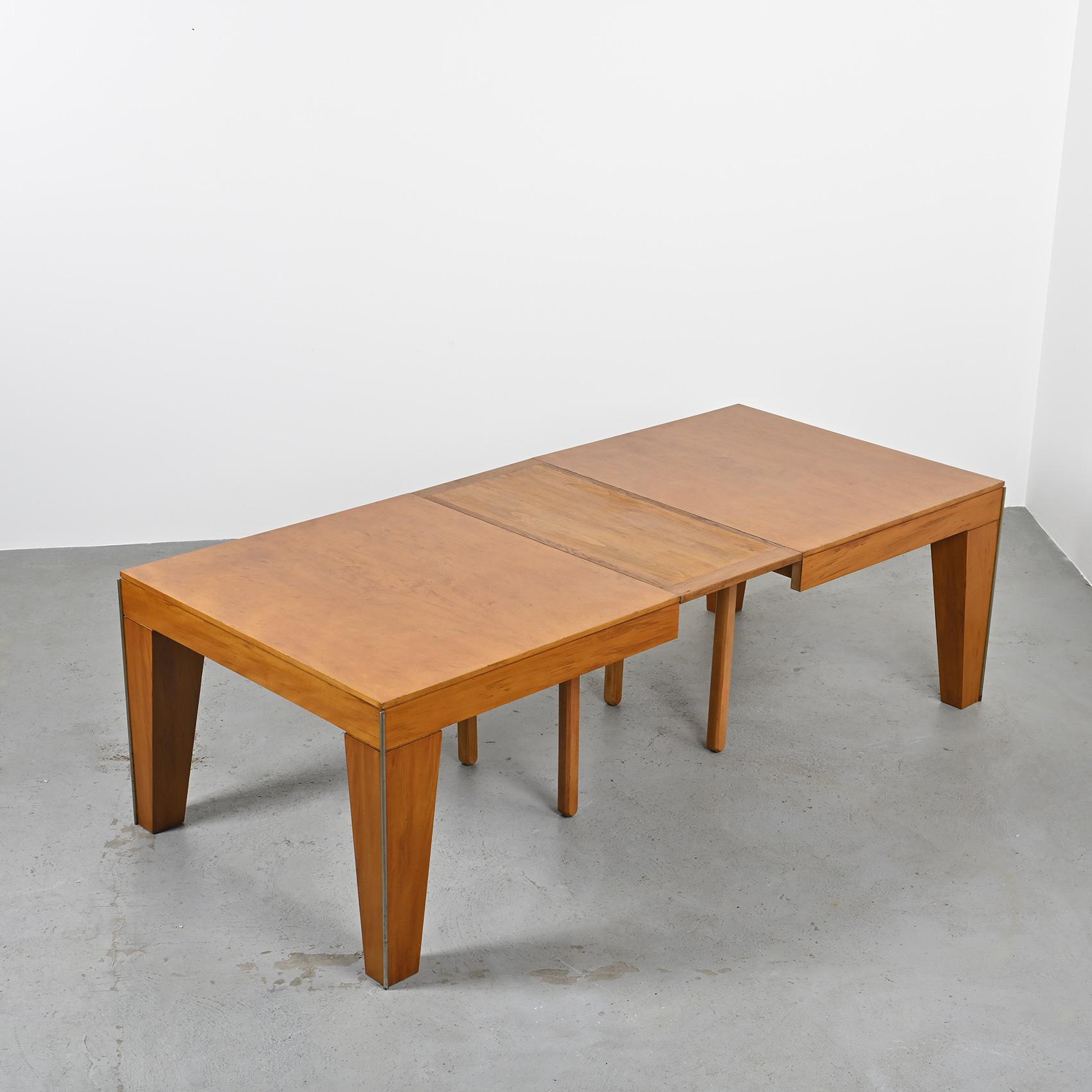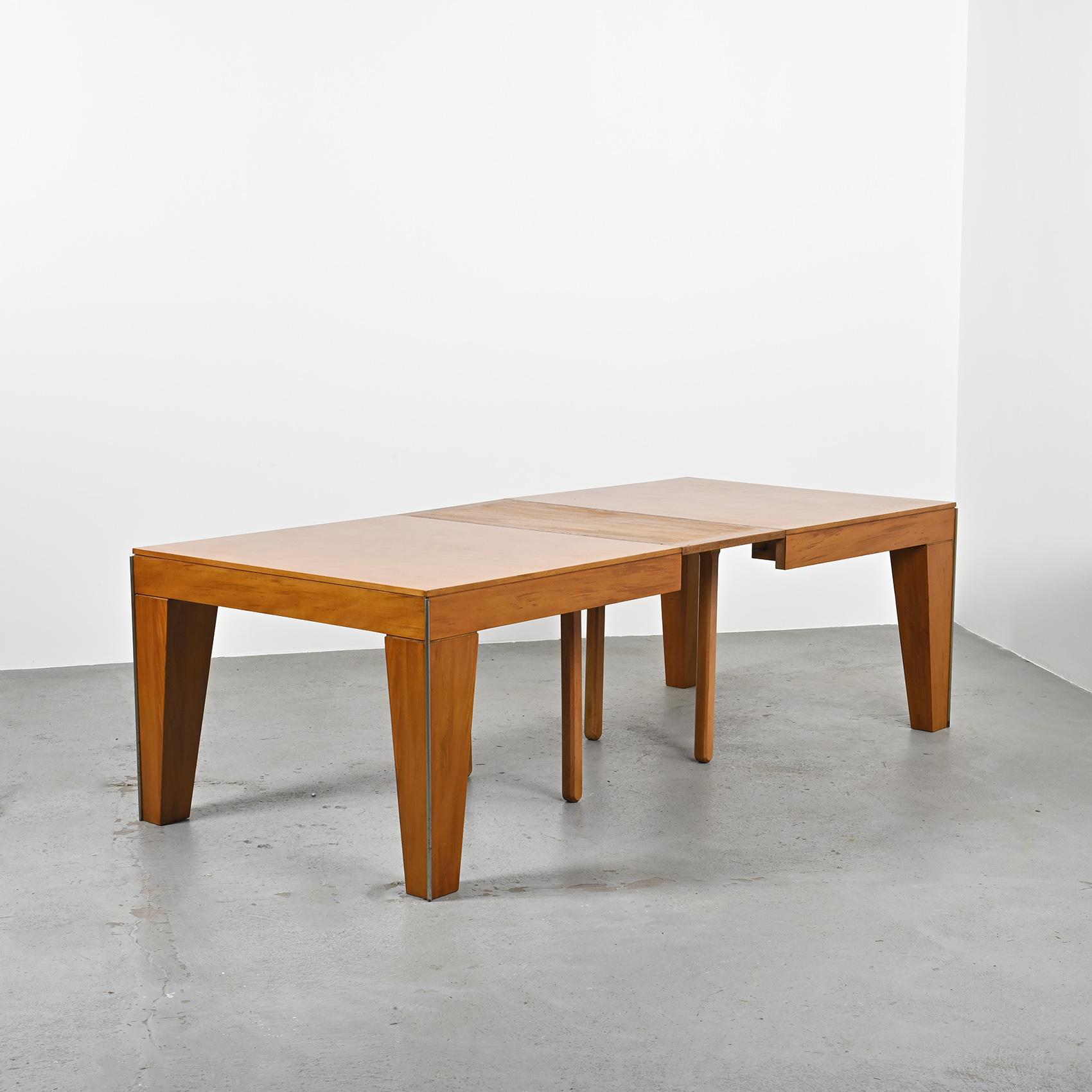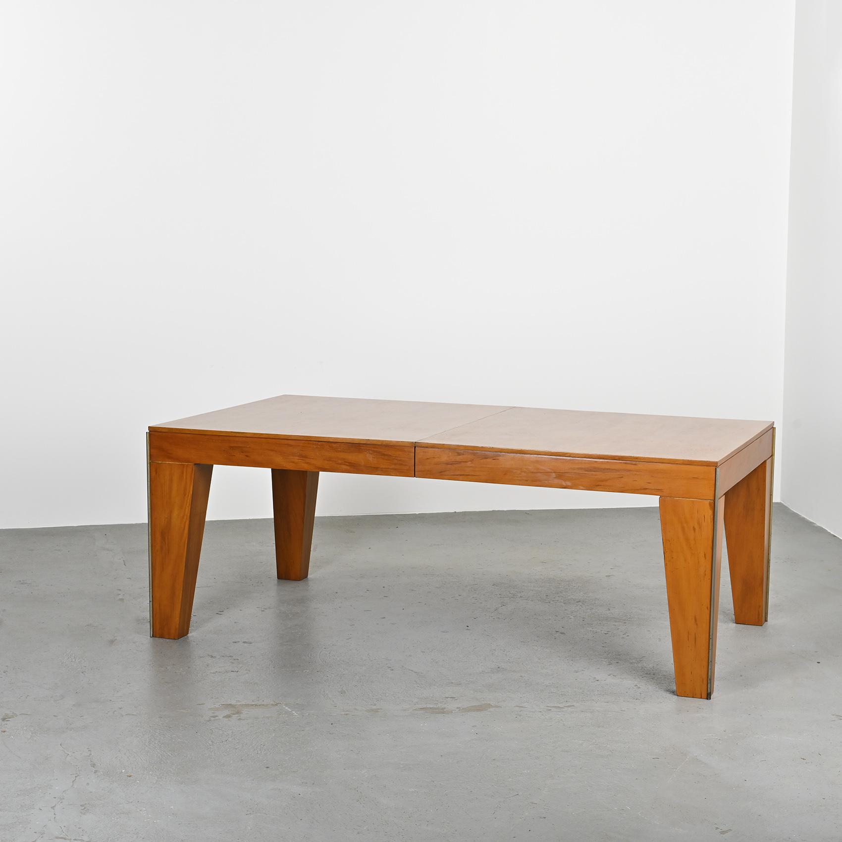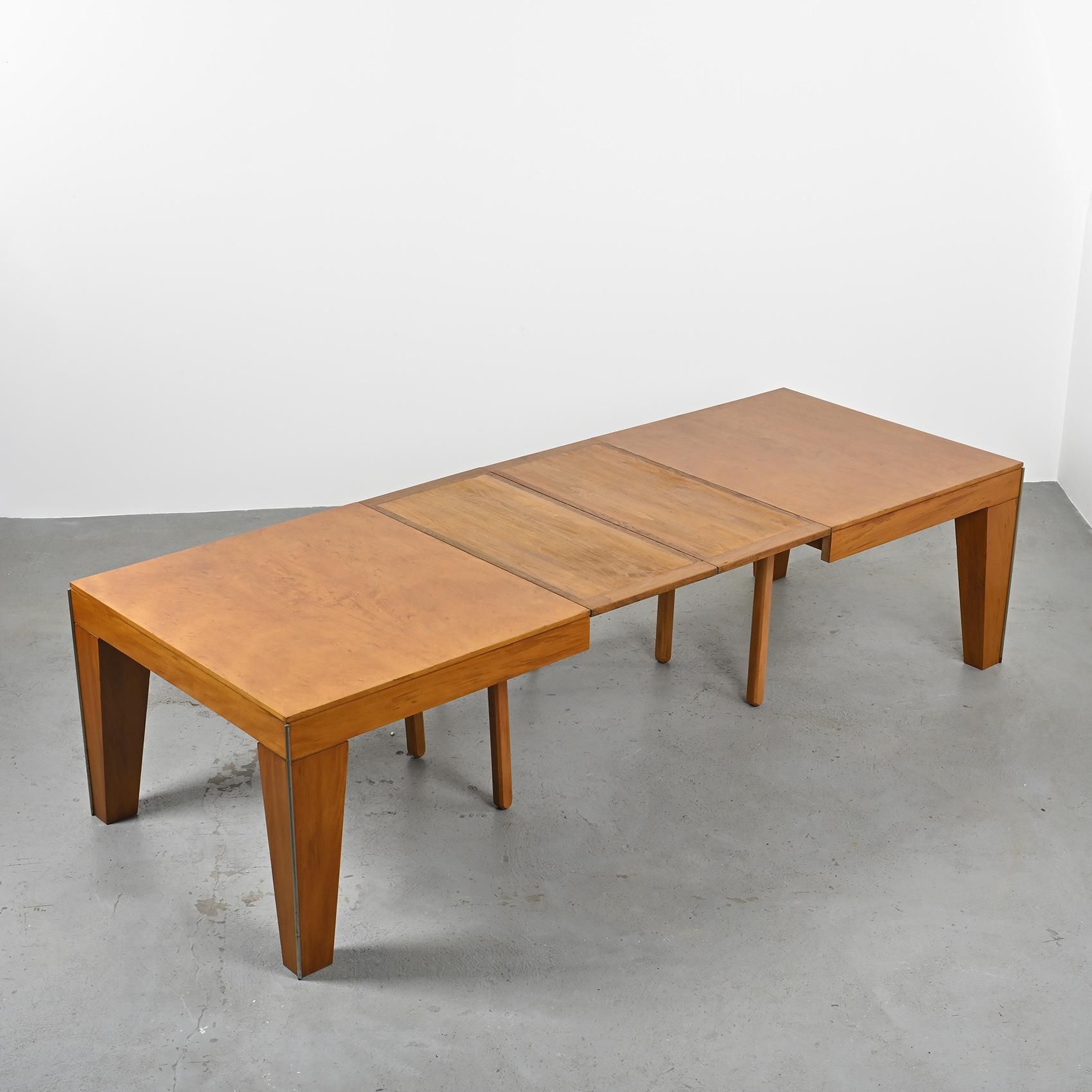 Cette pièce emblématique témoigne du langage formel développé par Sornay au tournant des années 30 : une rigueur géométrique, tempérée par une élégance sobre. Les quatre pieds légèrement évasés sont gainés et ornés de discrets tubes en aluminium, une signature technique de l'époque. Le plateau rectangulaire, en placage de merisier, accueille deux rallonges de 50 cm chacune, permettant d'adapter la table aux différents usages du quotidien ou des grandes réceptions.