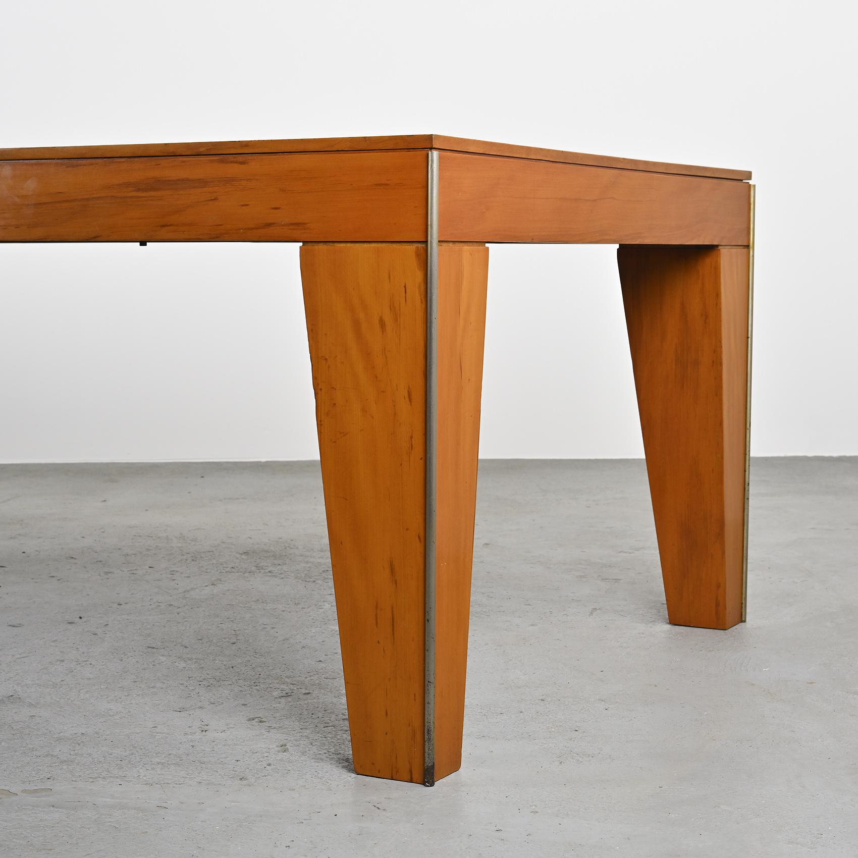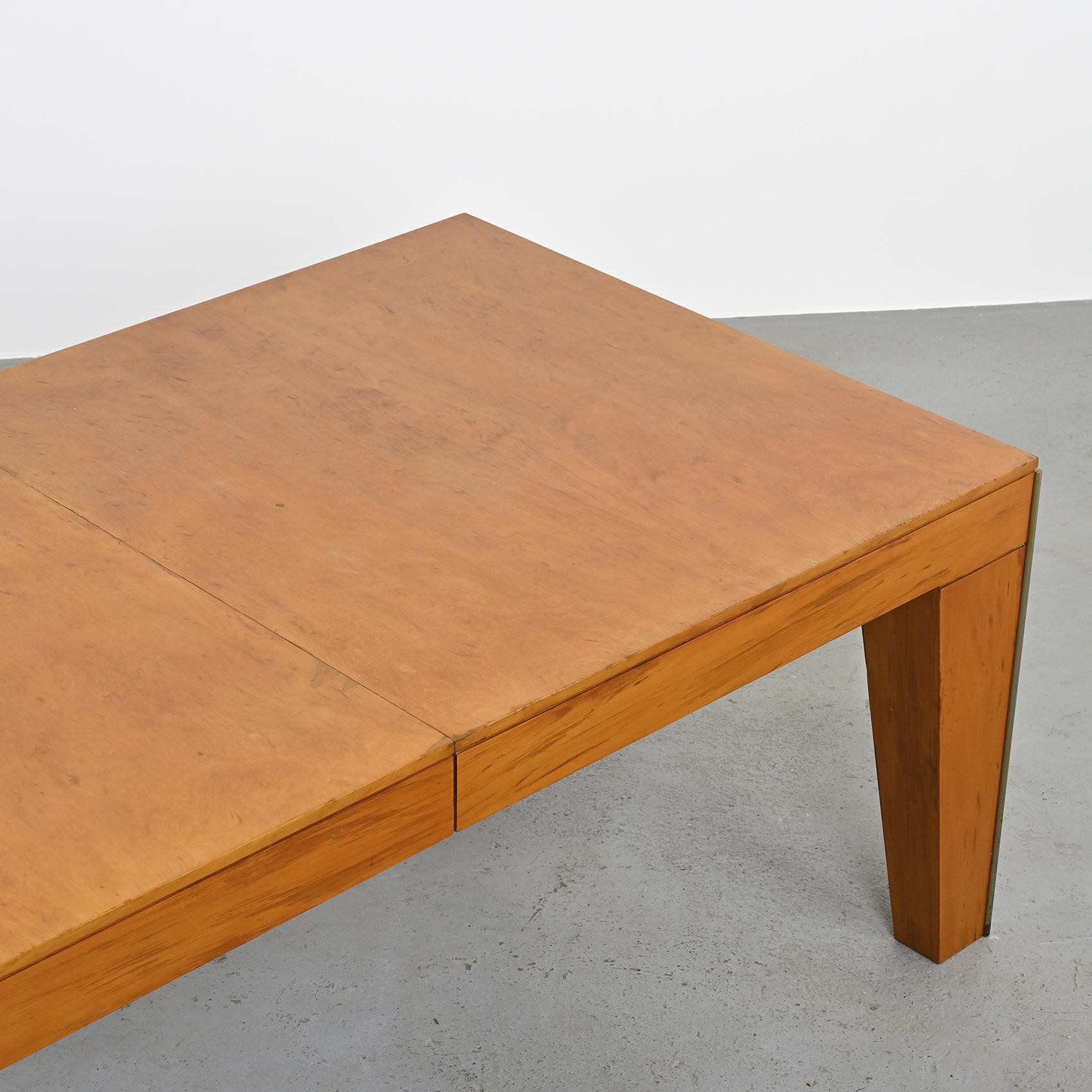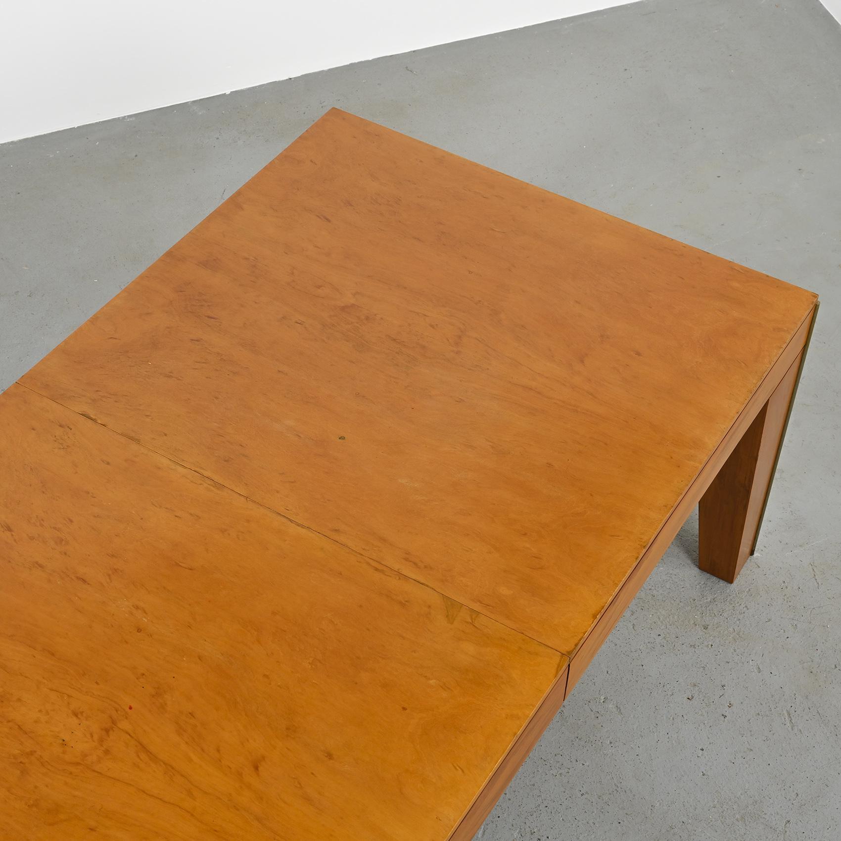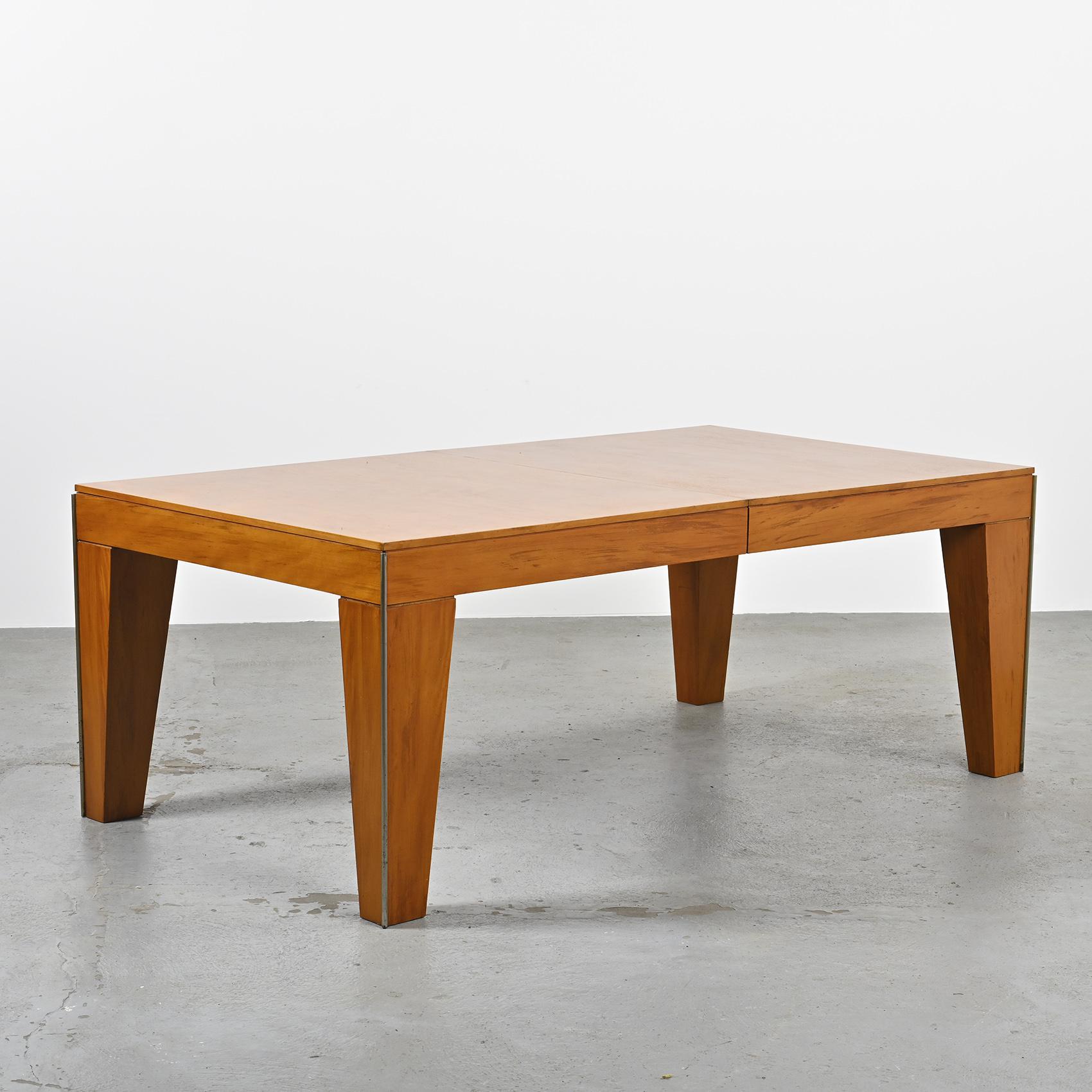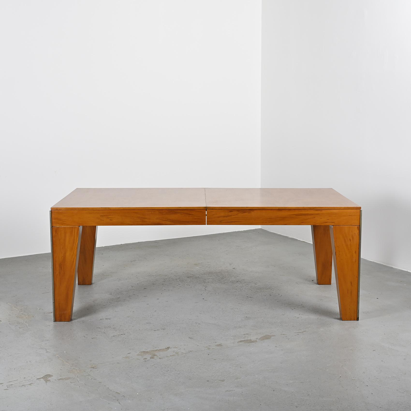Cette pièce emblématique témoigne du langage formel développé par Sornay au tournant des années 30 : une rigueur géométrique, tempérée par une élégance sobre. Les quatre pieds légèrement évasés sont gainés et ornés de discrets tubes en aluminium, une signature technique de l'époque. Le plateau rectangulaire, en placage de merisier, accueille deux rallonges de 50 cm chacune, permettant d'adapter la table aux différents usages du quotidien ou des grandes réceptions.