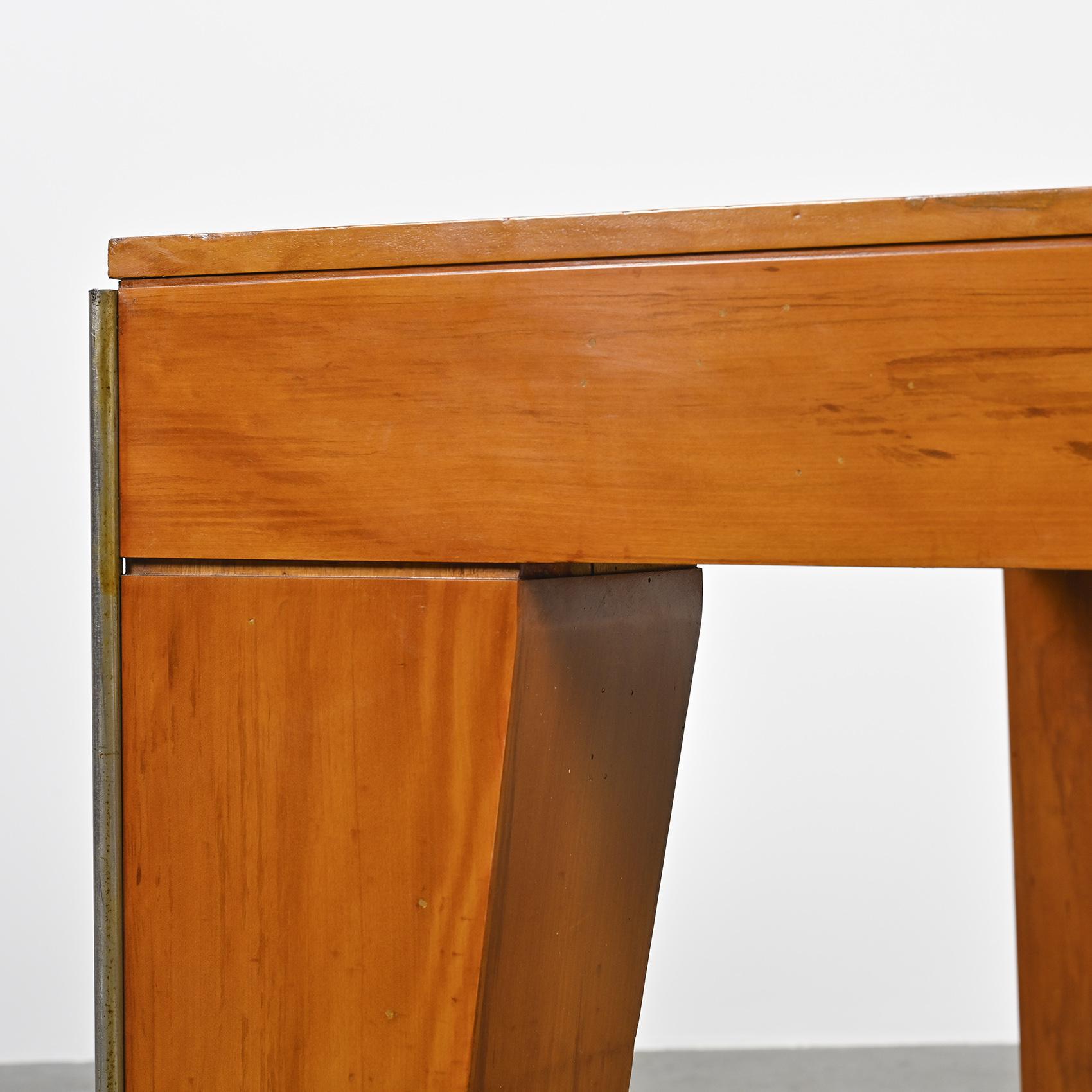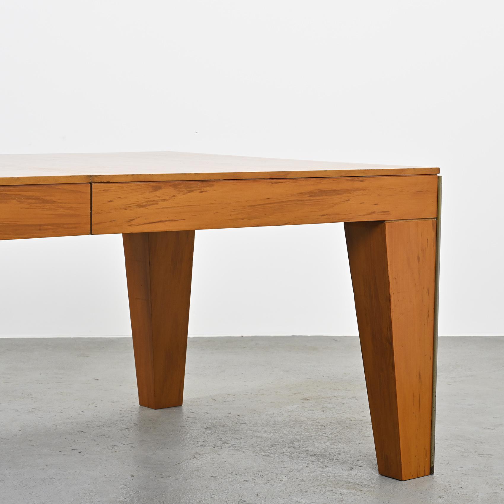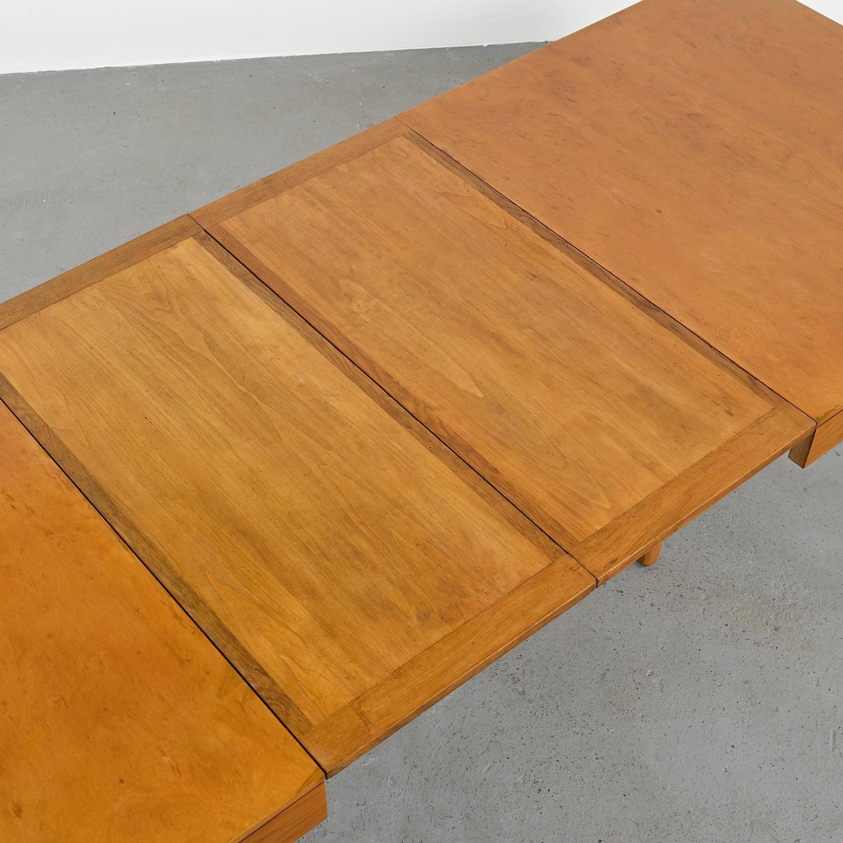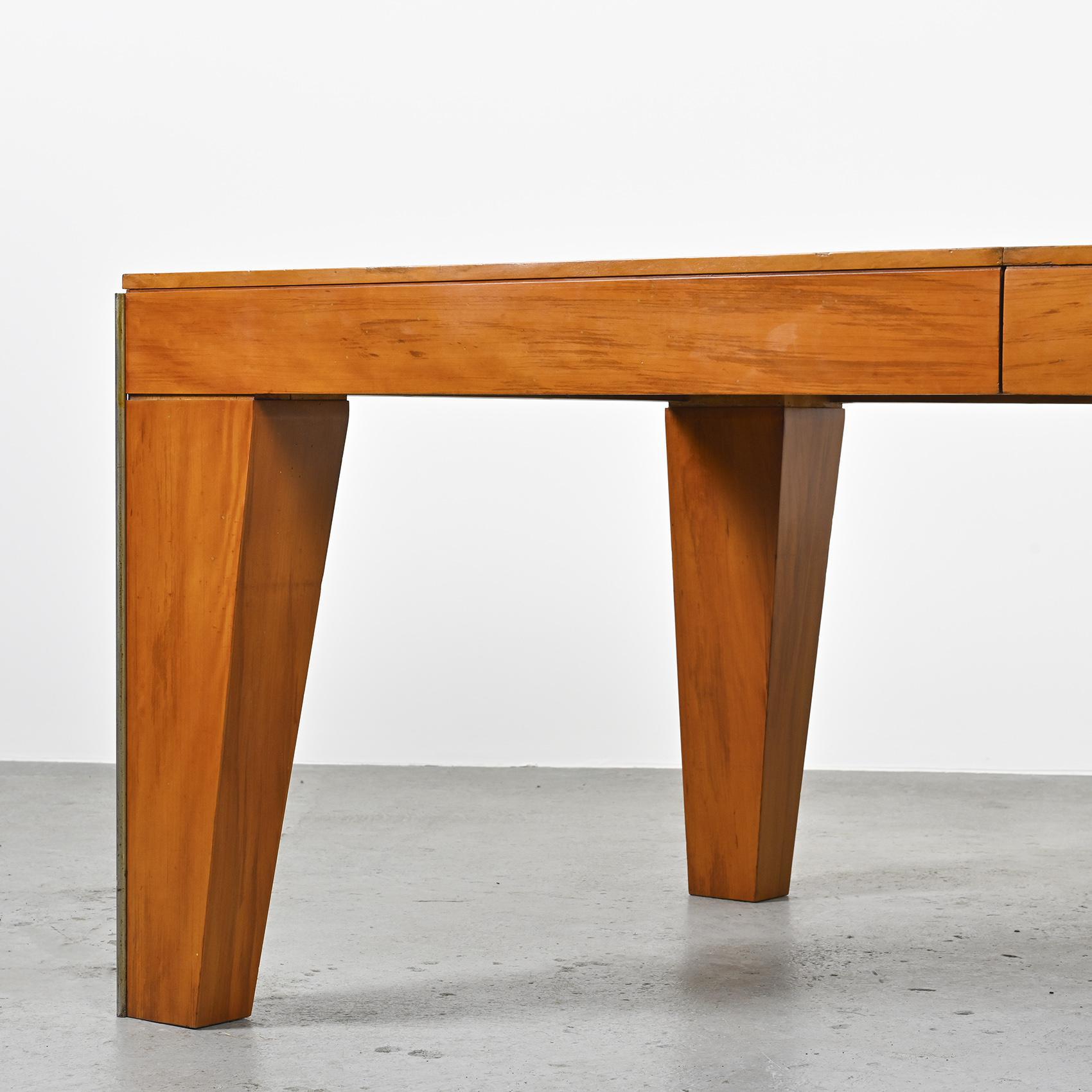 Cette pièce emblématique témoigne du langage formel développé par Sornay au tournant des années 30 : une rigueur géométrique, tempérée par une élégance sobre. Les quatre pieds légèrement évasés sont gainés et ornés de discrets tubes en aluminium, une signature technique de l'époque. Le plateau rectangulaire, en placage de merisier, accueille deux rallonges de 50 cm chacune, permettant d'adapter la table aux différents usages du quotidien ou des grandes réceptions.