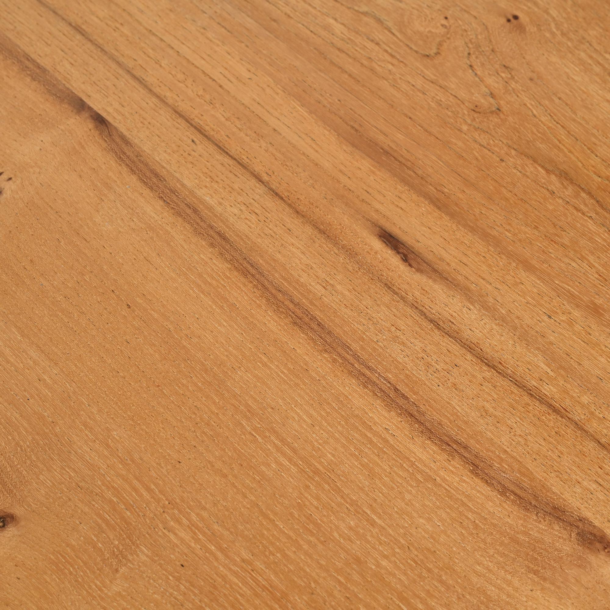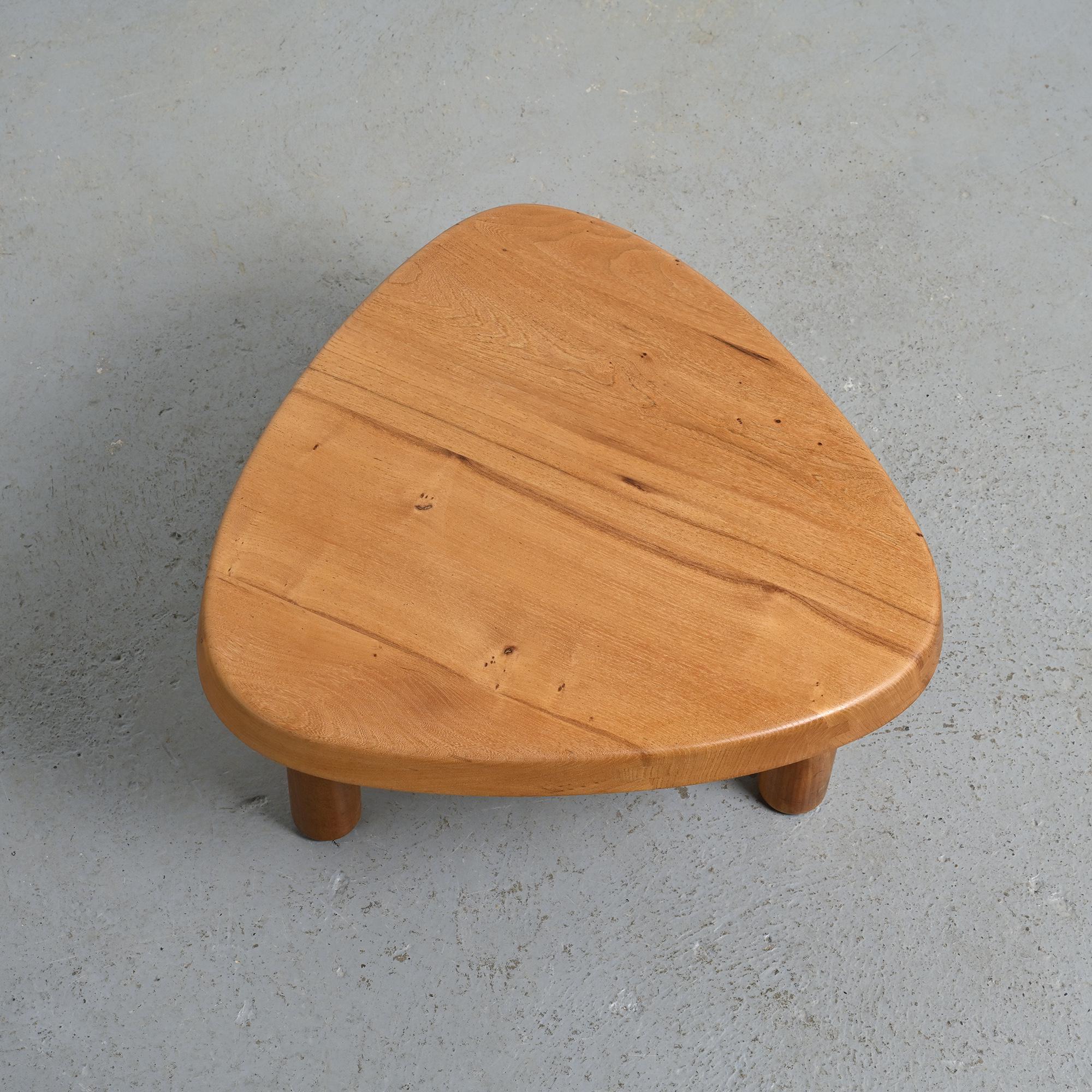 Cette table se distingue par son épais plateau triangulaire aux angles arrondis et sa ceinture à léger biais, reposant sur trois pieds cylindriques en orme massif. L'assemblage à tenons et mortaises latéral révèle le soin du détail et la construction robuste propre aux créations de Pierre Chapo.