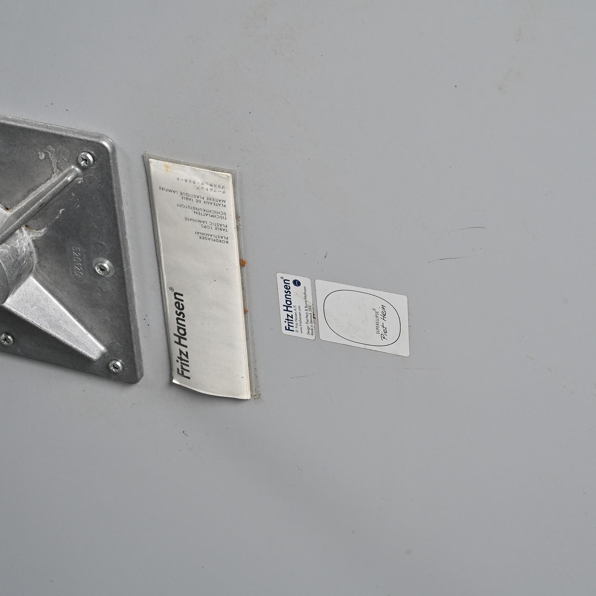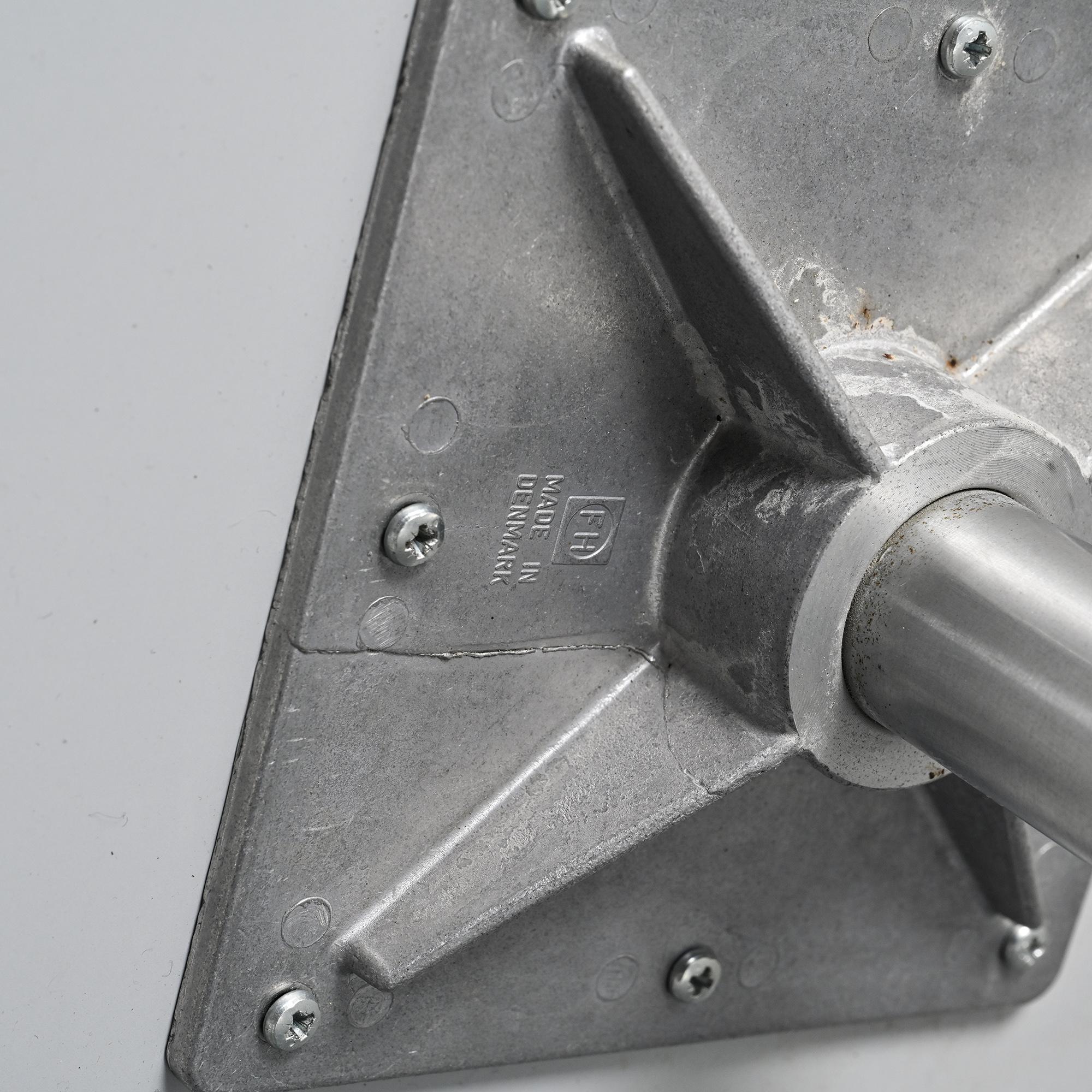 Le plateau rond en stratifié blanc présente un bord légèrement adouci et repose sur un piètement central en aluminium moulé à quatre branches. Cette base dite "star" est caractéristique des créations d'Arne Jacobsen, notamment développées pour ses ensembles de tables et sièges dans les années 1960. L'ensemble offre une silhouette légère et équilibrée, avec une grande stabilité et une lisibilité formelle typique du design danois moderniste.